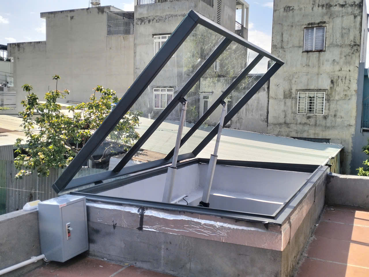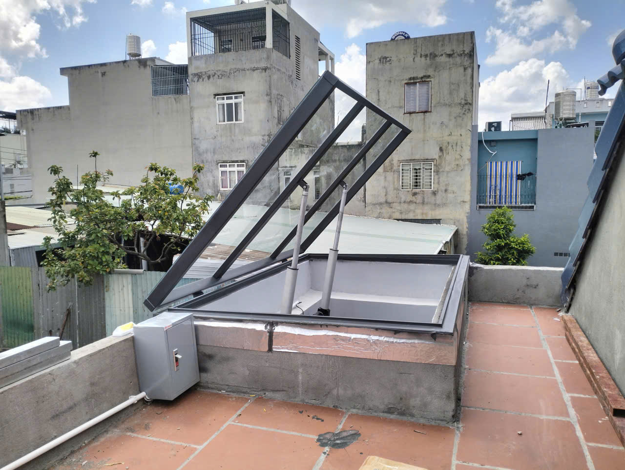 Mái có sử dụng 2 động cơ đẩy đồng tốc giúp chịu tải cho mái,sử dụng cảm biến mưa tự động đóng mở khi mưa xuống.