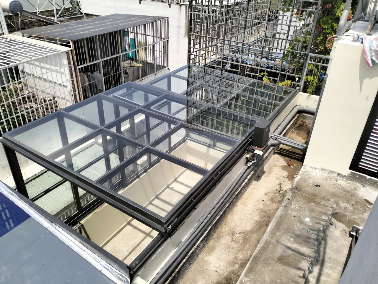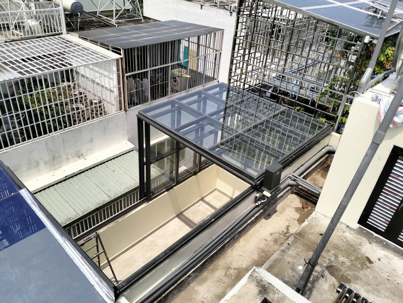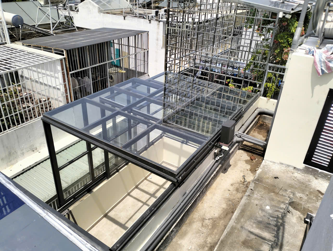 Mái che tự động làm kiểu chữ L ,có kết cấu bằng sắt hộp kẽm 40*80 dầy 1.4 li .giúp cho mái chắc khỏe ,bền.kính mái che sử dụng tấm kính 8li cường lực trắng.giúp lấy ánh sáng tối đa cho sân thượng .