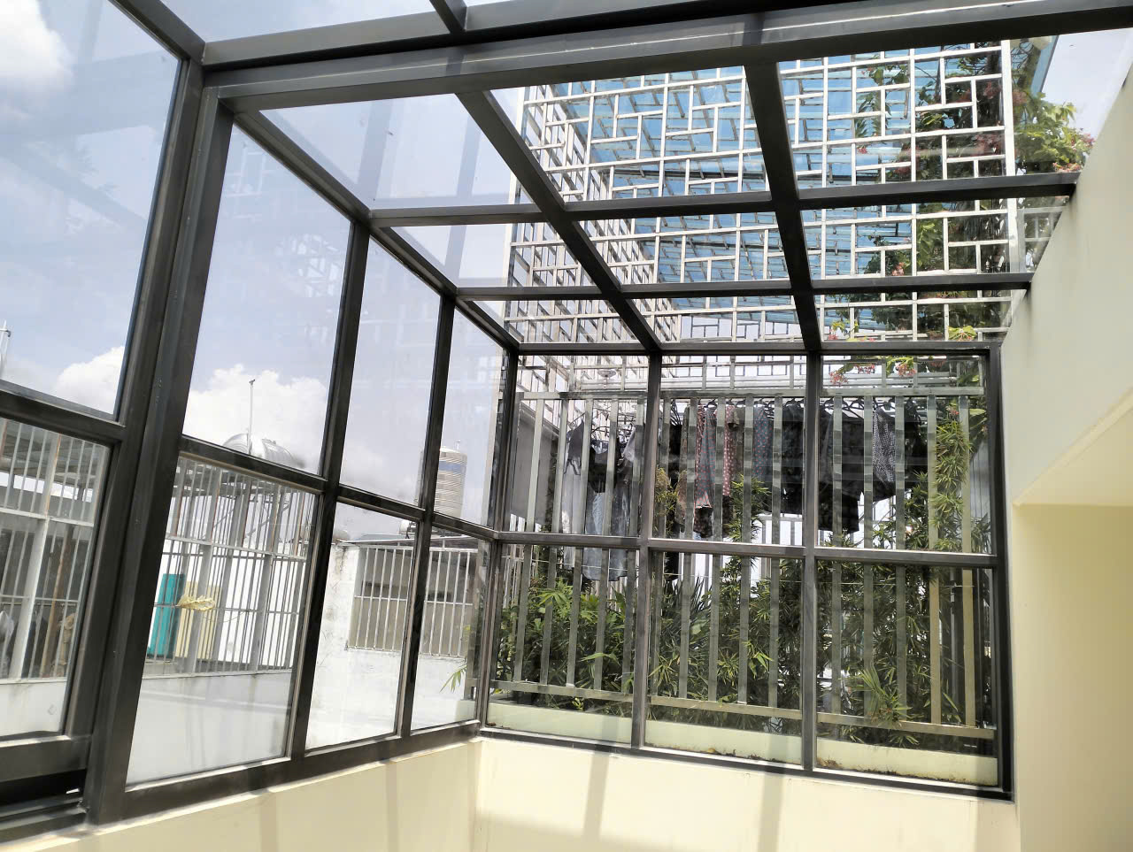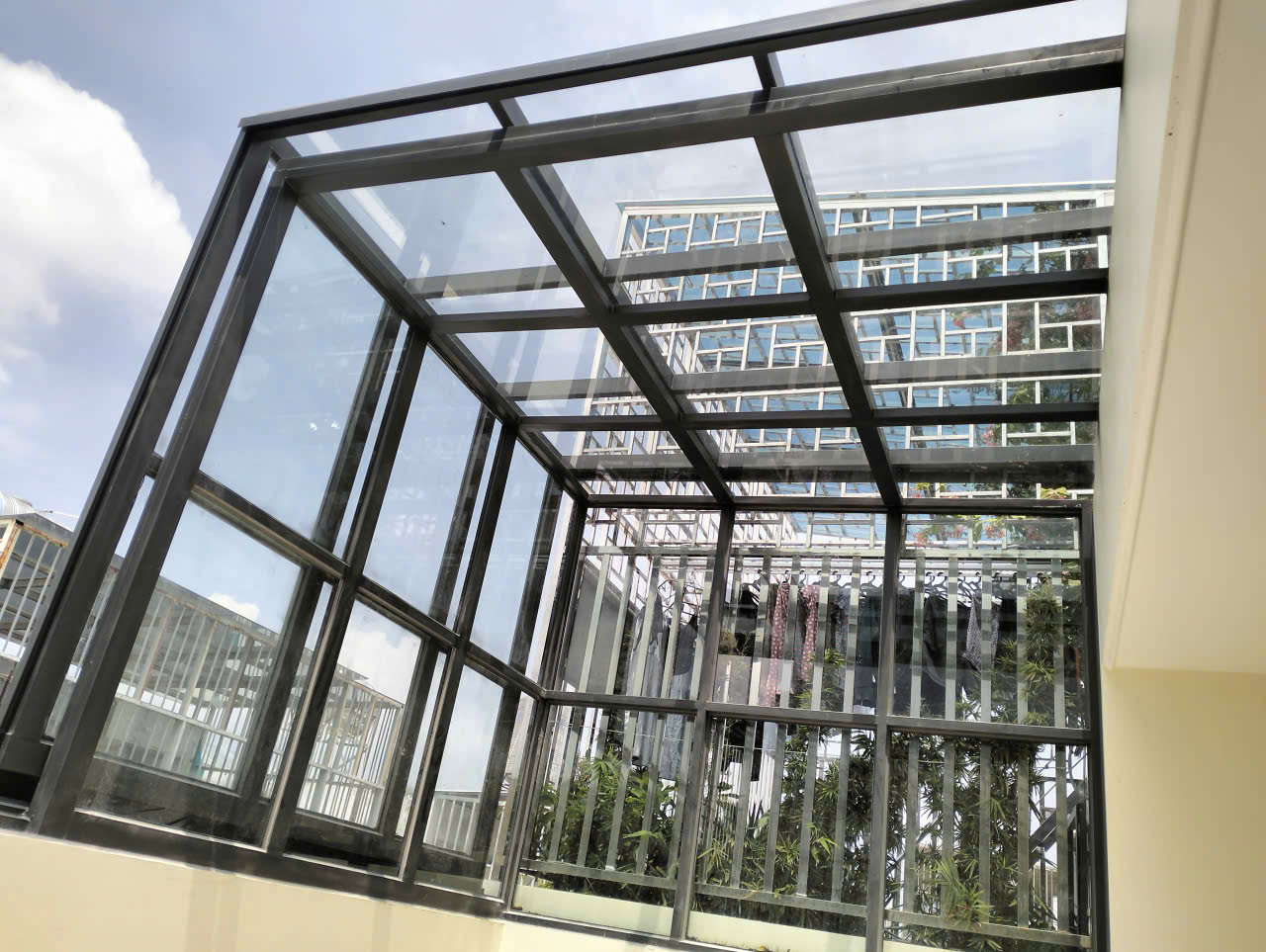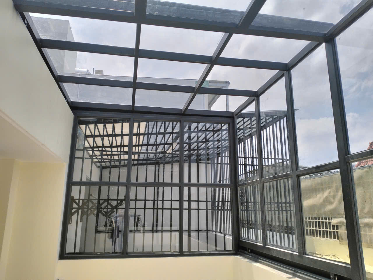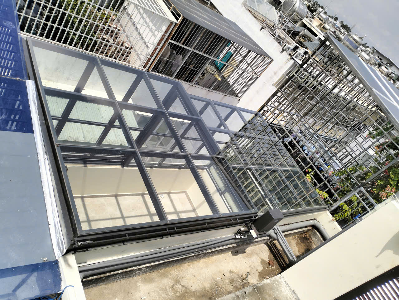 Mái che tự động làm kiểu chữ L ,có kết cấu bằng sắt hộp kẽm 40*80 dầy 1.4 li .giúp cho mái chắc khỏe ,bền.kính mái che sử dụng tấm kính 8li cường lực trắng.giúp lấy ánh sáng tối đa cho sân thượng .